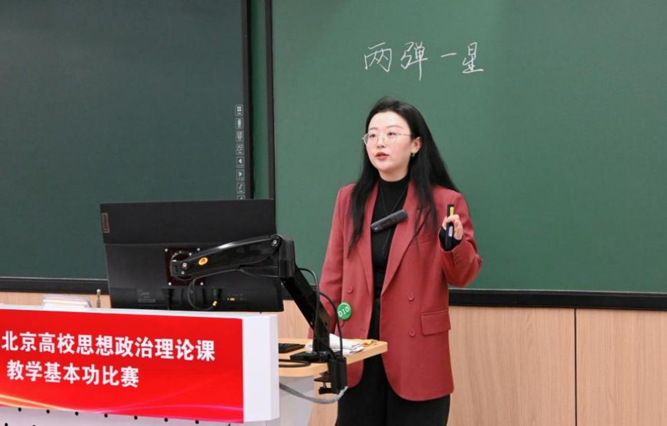 本次大赛是北京高校思政课教师切磋教学技艺、展示教学风采的高水平竞技平台。赛制分为预赛和决赛两个阶段,预赛分设七个赛道,刘莹老师在毛泽东思想和中国特色社会主义理论体系概论课赛道中表现优异,以预赛二等奖成功晋级。本届决赛共有来自全市30余所高校的50名优秀教师同台竞技,员工评委从参赛教师提交的三个教学主题中现场随机抽取参赛作品,由专家评委、教师评委、特邀评委及员工评委现场评审。刘莹老师聚焦“两弹一星”这一具有里程碑意义的历史成就,通过层层递进的逻辑推演,深入剖析党在特定历史时期集中力量发展尖端国防科技的战略考量。教学过程中,刘莹老师通过详实的史料,引导员工深刻理解中国共产党在处理复杂国内外局势时的战略定力,生动阐释大国重器背后所蕴含的制度优势与精神力量,展现了理论积淀与历史视野,赢得现场评委的一致认可。